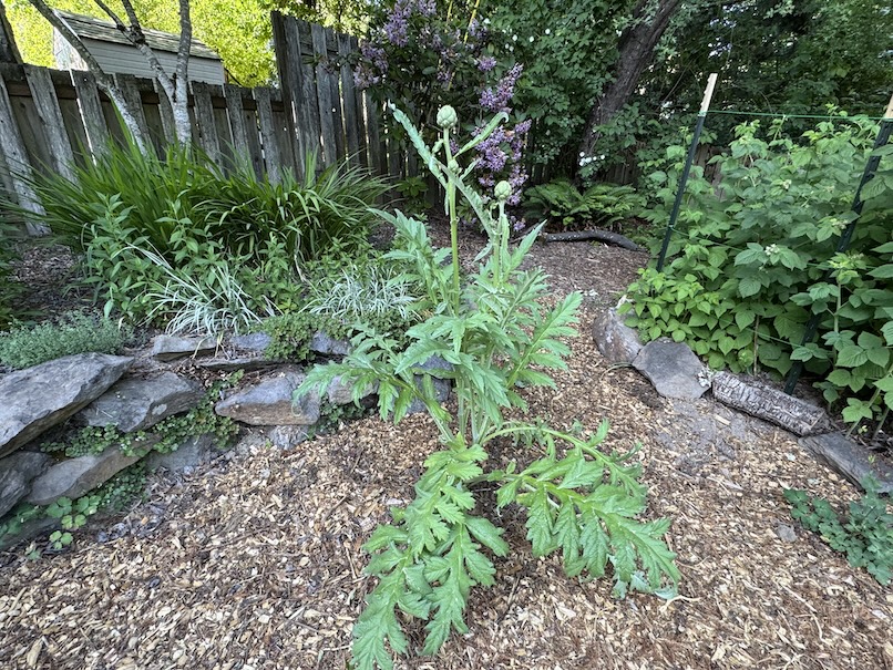 The artichoke is my wild child. One of two globe artichokes planted last spring, it’s the only one that survived, and barely so. It almost died itself from something digging at the roots, which required a lot of prop-up supports so that it wouldn’t collapse while the roots had additional time to secure themselves. After a bit of extra nurturing last season it now seems firmly established. I don’t plan on harvesting any heads this season either to allow further development. Patience is key with perennials and the lack of artichoke harvest doesn’t bother me because the heads blossom into amazing purple flowers that the bees adore.