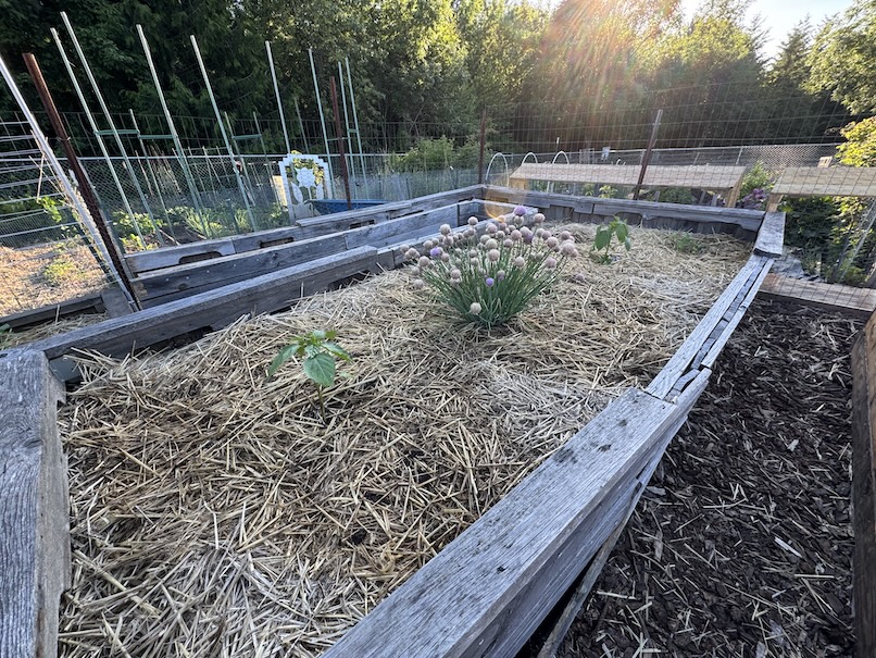 This is the last year you’ll see the big bed in such a decrepit state. The horseshoe is the last remaining bed to be rebuilt as it slowly deteriorates wooden slat by wooden slat. The final task assigned to the old Big Birtha Bed will be another new crop for me. Tomatillos! A red and green variety stake claim to each end, divided by the plot’s centerpiece and matriarch, the chive plant. Green salsa is on my list of experiments to make fresh, so these should help achieve that mission. aka I love tacos. The chives have already peaked (flower wise), but the buzzing insects still love visiting from time to time.